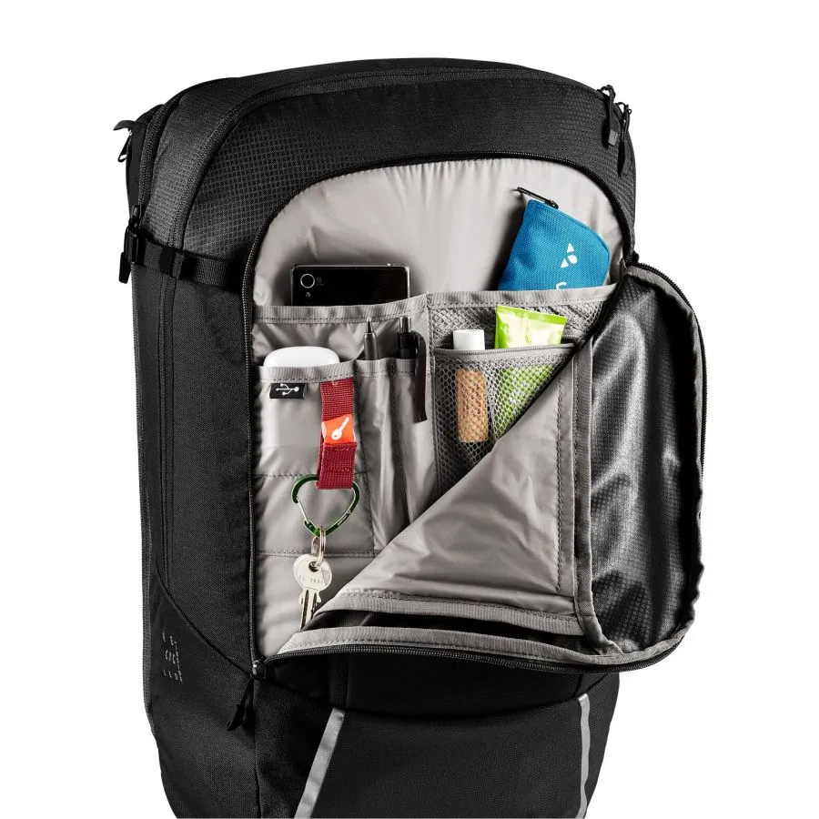 La alforja se fija al portaequipajes mediante un gancho QMR que se cierra con un candado (por ej. candado Abus 145/20, no incluido) y se puede convertir rápidamente en mochila. Para ello se abren ambas cremalleras verticales y se guarda el sistema de fijación en un compartimento con cierre de velcro. Esta inteligente combinación de mochila y alforja para bicicleta tiene mucho para ofrecer.