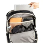 Tiene un compartimento principal más amplio que permite guardar documentos en tamaño A4, la botella de agua, la merienda y la muda. En un compartimento separado acolchado con cierre de cremallera se pueden guardar computadores portátiles con un tamaño de hasta 15,6″. El bolsillo que cubre la parte delantera se abre de forma diagonal y contiene un organizador de malla para el móvil, las llaves y el monedero. Este compartimento comprende, además, un bolsillo plano de malla en el que se pueden guardar revistas o ropa húmeda. Dos correas laterales de compresión, un soporte para casco y la funda para lluvia incluida completan este equipamiento. El material principal de la Cycle 28 Luminum está fabricado con un 50% de poliéster reciclado y el material de contraste con un 100%.
