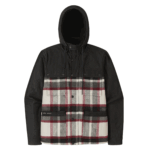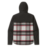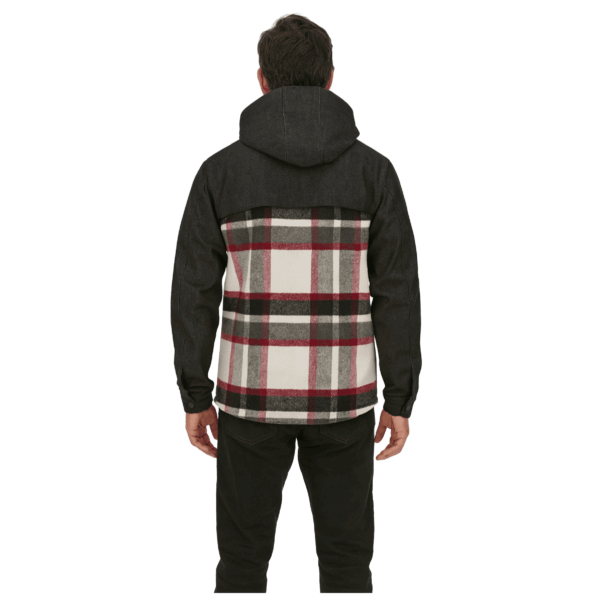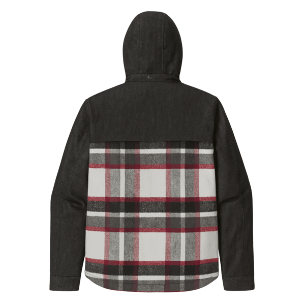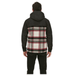 El cuerpo presenta un tejido de paño grueso con patrón escocés en tonos rojo, negro y gris, que aporta calidez visual y un estilo inconfundible. La parte superior y las mangas, en tela negra de textura robusta, entregan estructura y durabilidad.