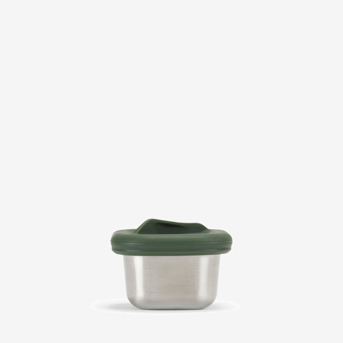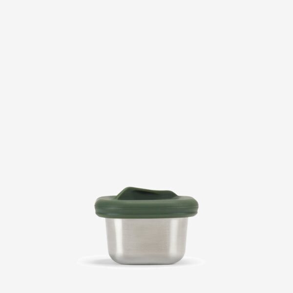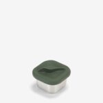 Pequeña caja de acero inoxidable y silicona hermética, ideal para guardar snacks o acompañamientos con estilo y practicidad.