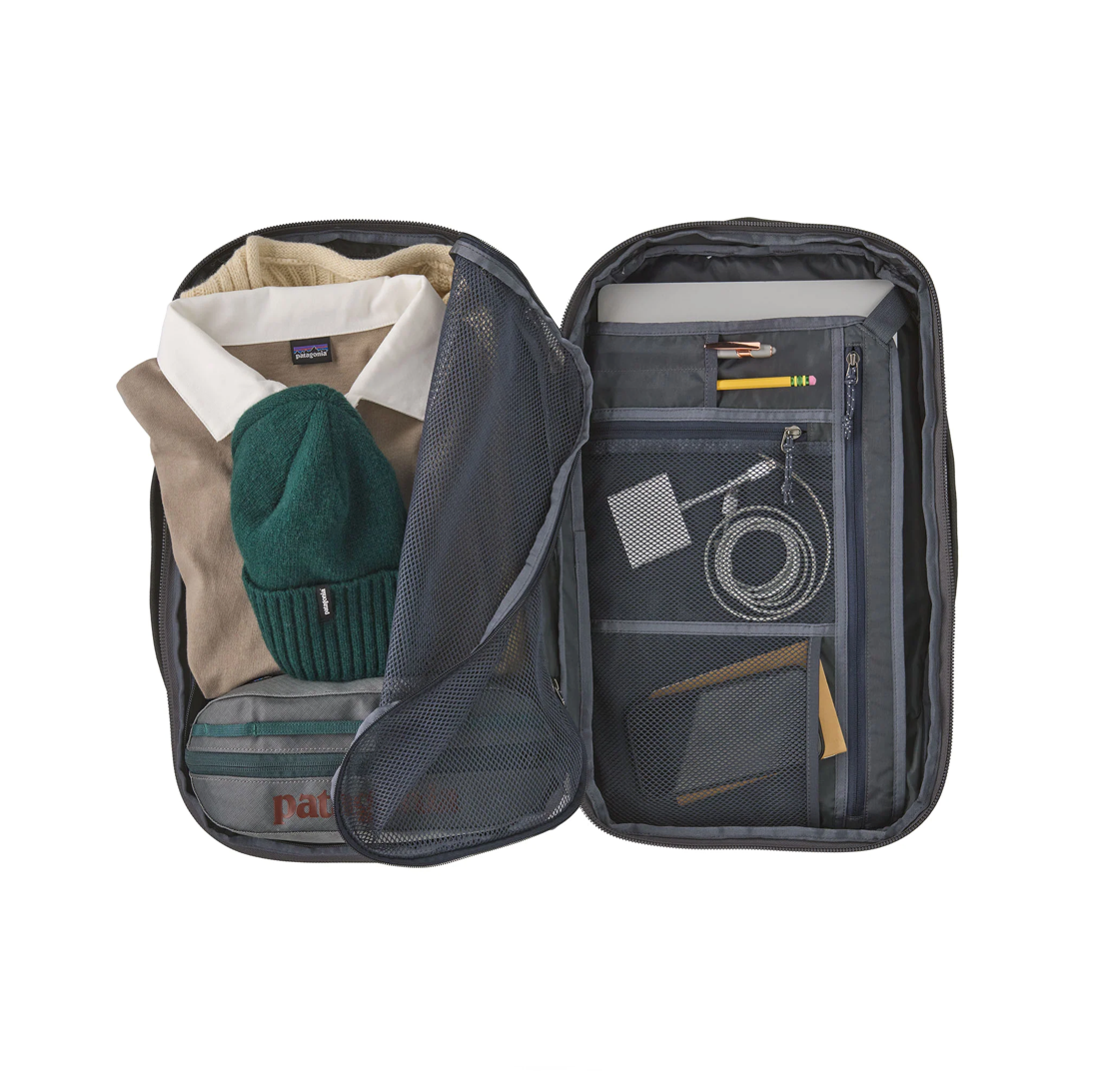 Diseño compacto y versátil para viajes, con gran organización, múltiples formas de uso y materiales reciclados resistentes al clima y al desgaste.