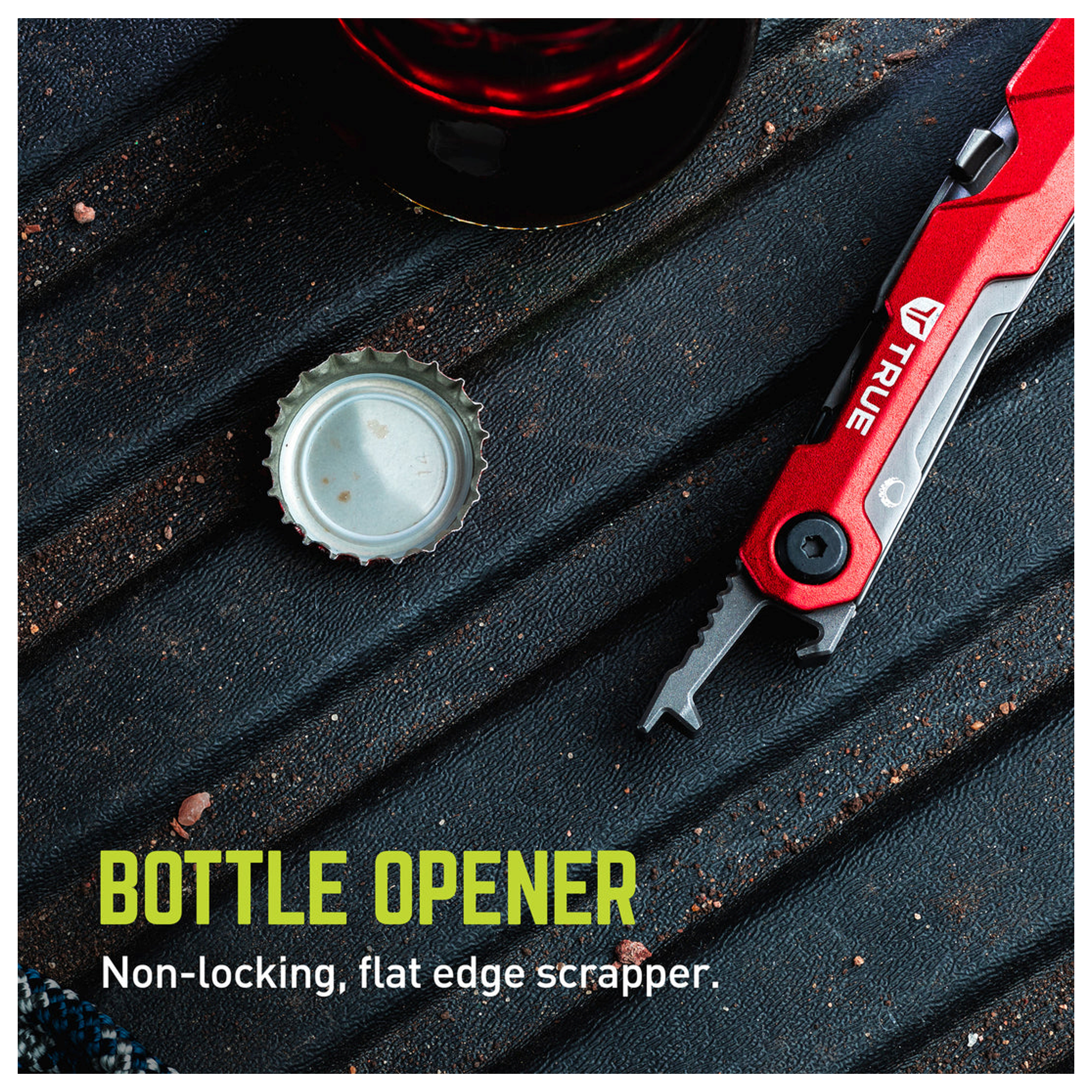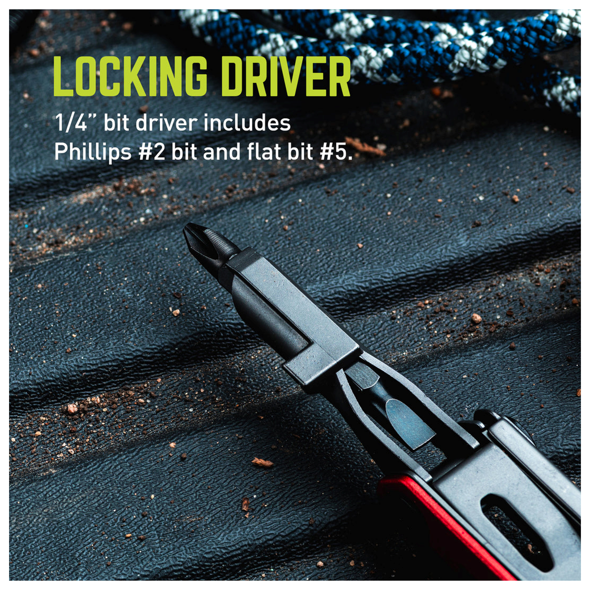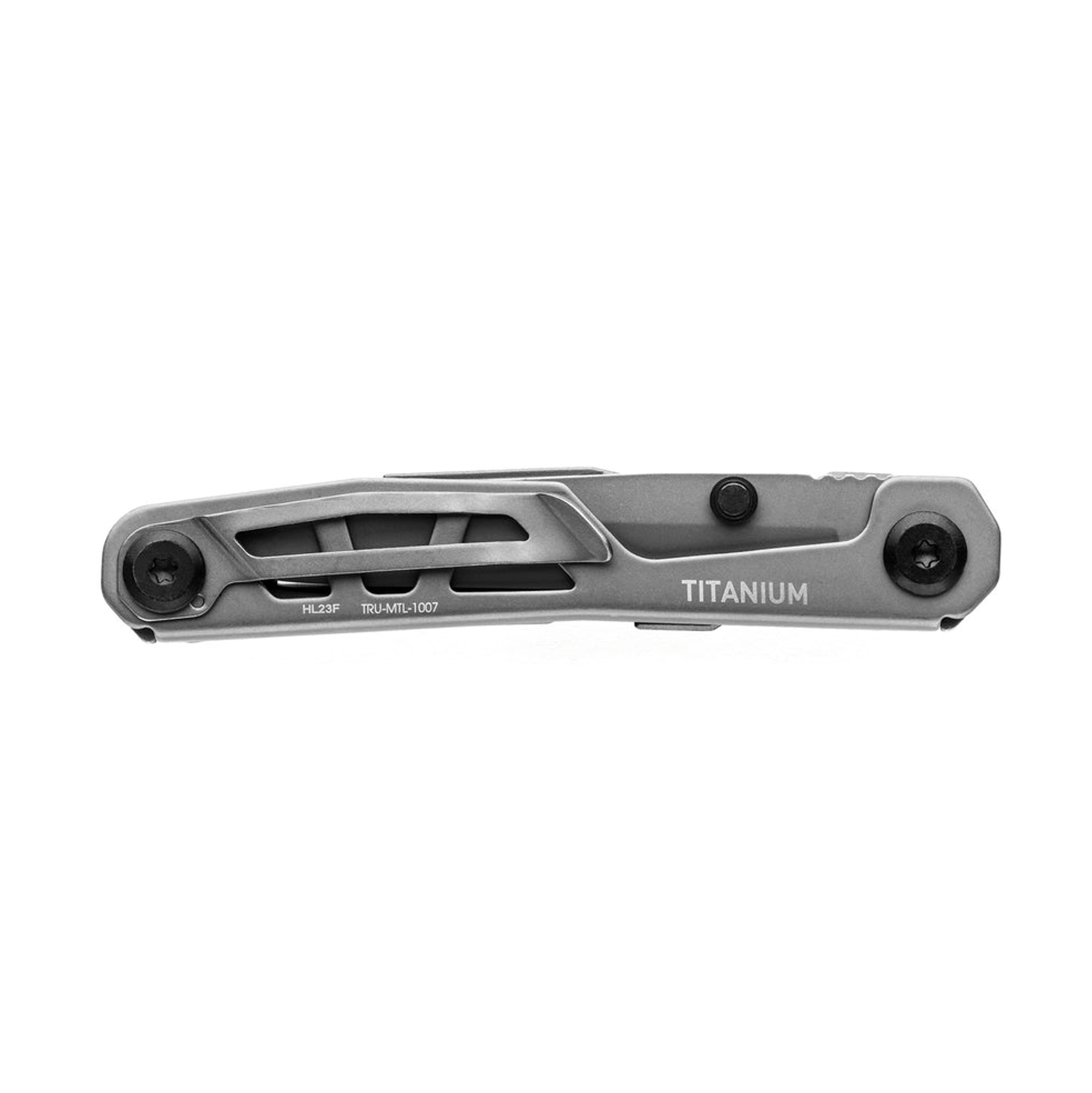 La multiherramienta de bloque de titanio está equipada con diversas herramientas útiles: una hoja Tanto de 6,98 cm, un raspador de filo plano, un abridor de botellas, un clip de bolsillo y un destornillador magnético con bloqueo. El destornillador incluye dos puntas intercambiables y cuenta con nuestro sistema patentado de bloqueo de dos posiciones, que se bloquea a 90° para adaptarse a espacios reducidos y a 180° para un mejor par y rendimiento. Cada herramienta está recubierta de nitruro de titanio para una mayor durabilidad y resistencia a la corrosión.