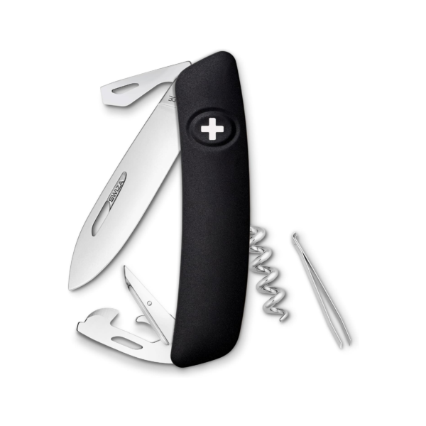 Navaja multiusos Swiza con 11 funciones. Gracias a su revolucionario diseño ergonómico de 360°, su hoja y herramientas tienen ranuras para facilitar la apertura con la mano izquierda o derecha. La hoja de acero inoxidable 440 con acabado pulido mide 7.5 cm y se bloquea mediante linerlock. Mango de goma resistente y antirayaduras con tacto suave.