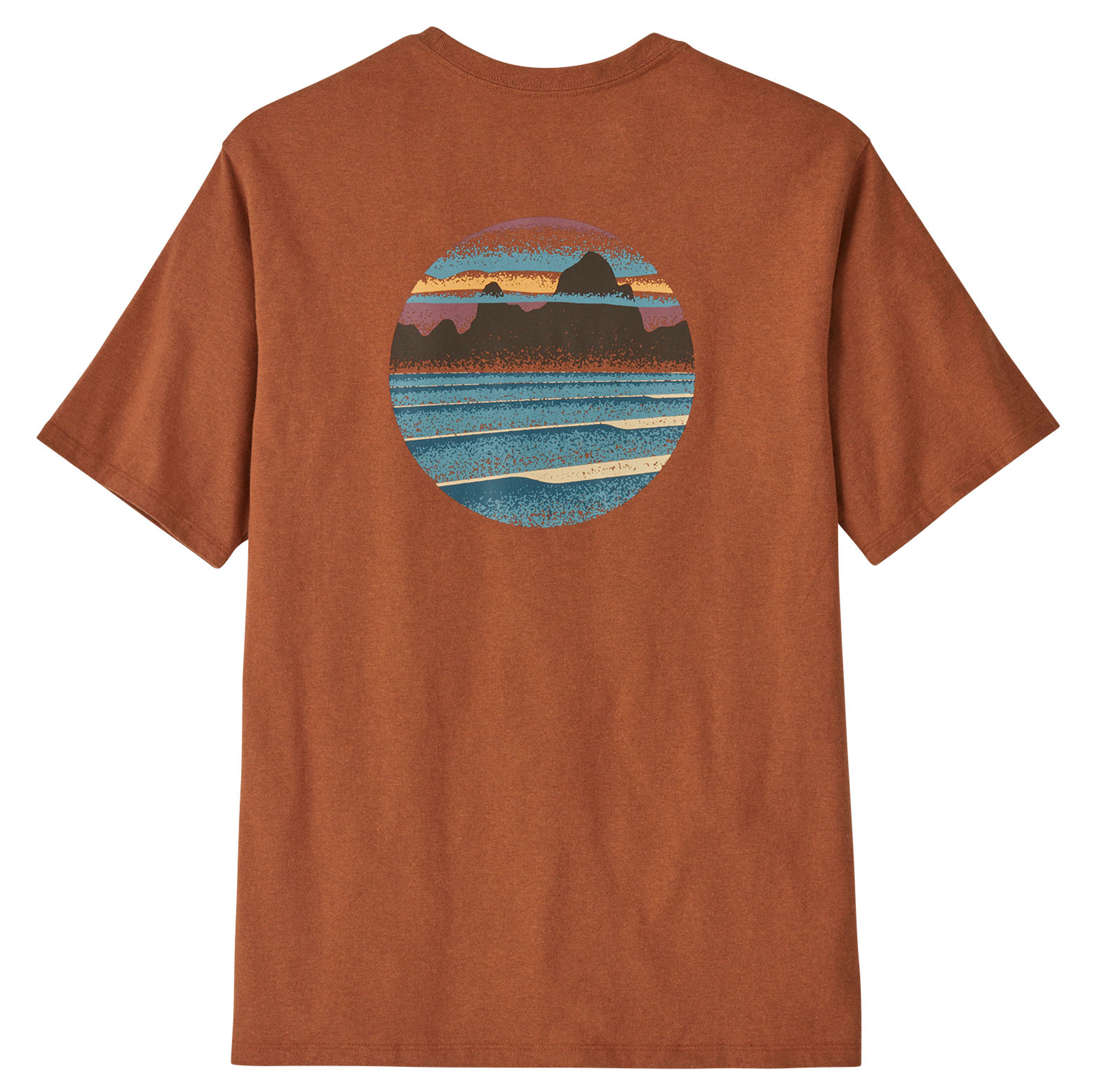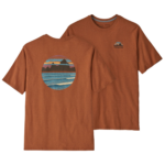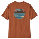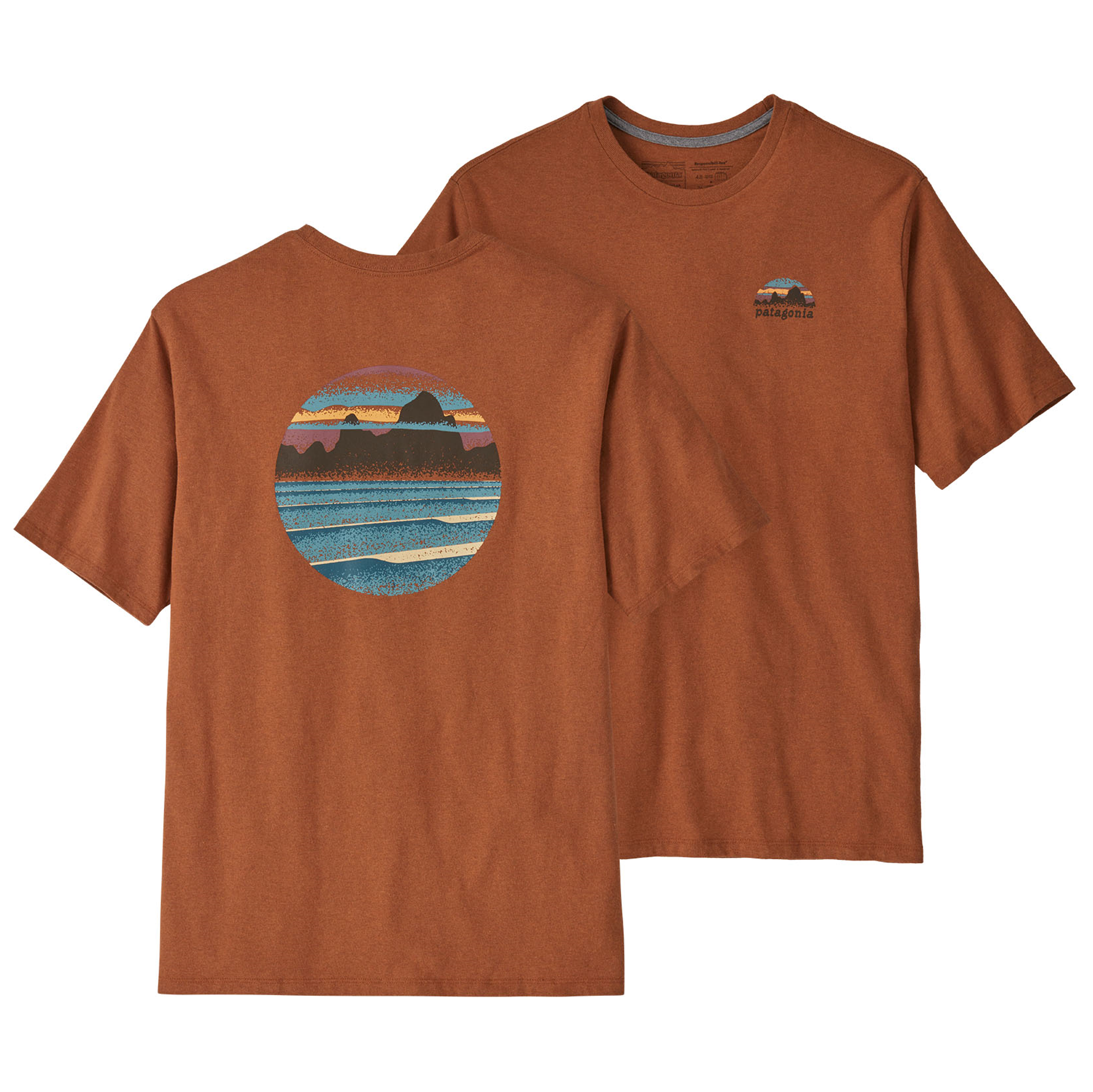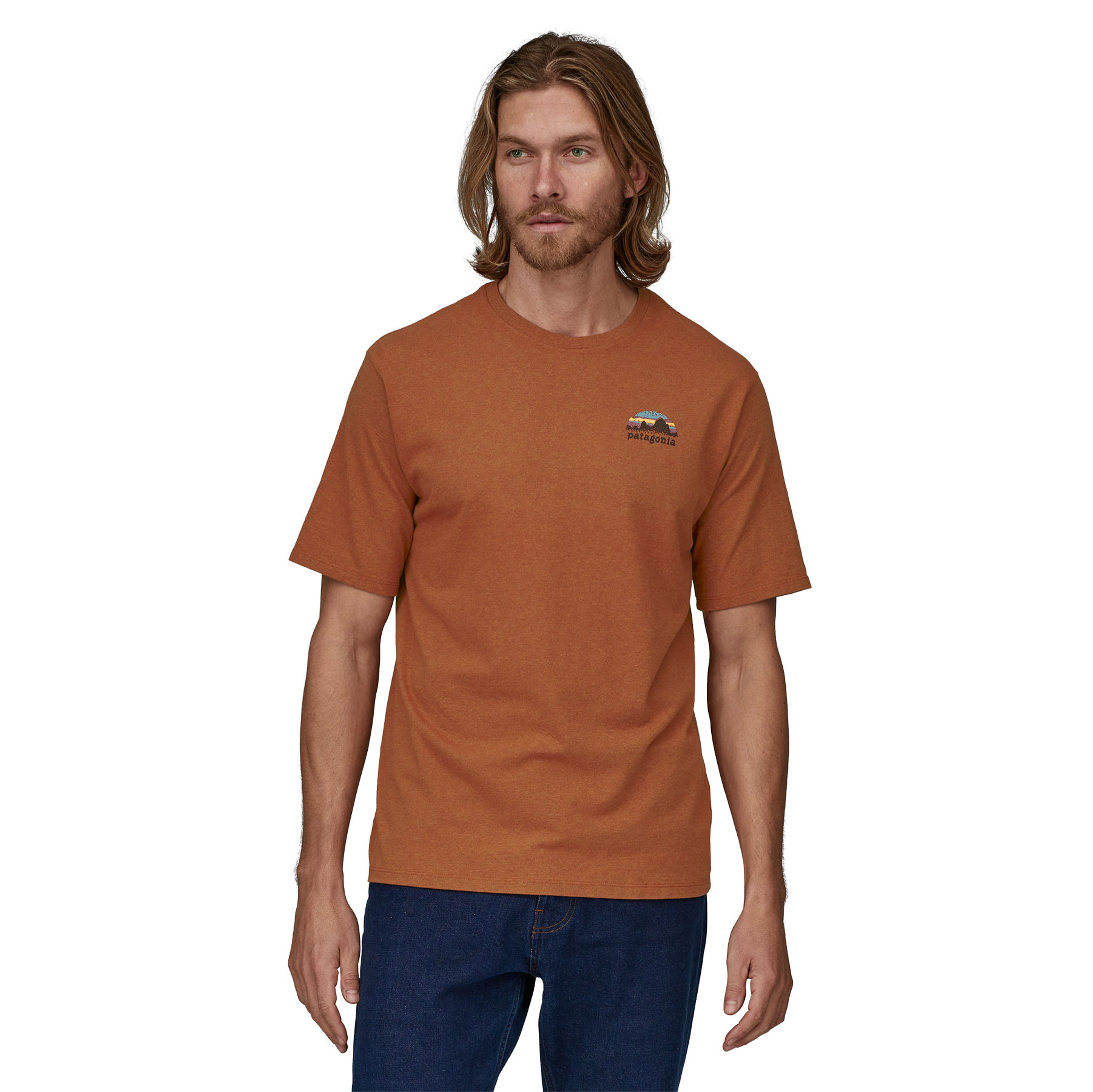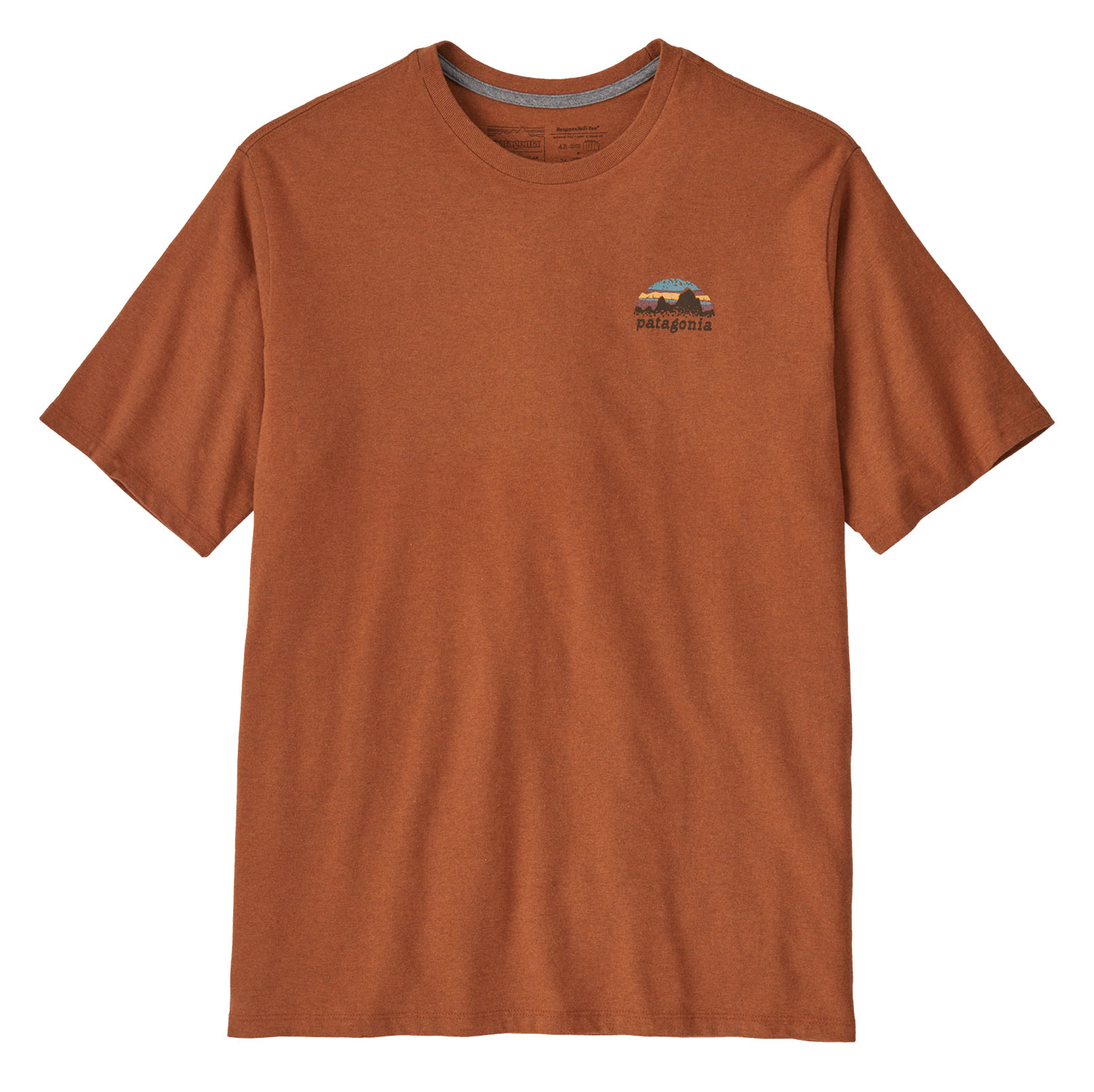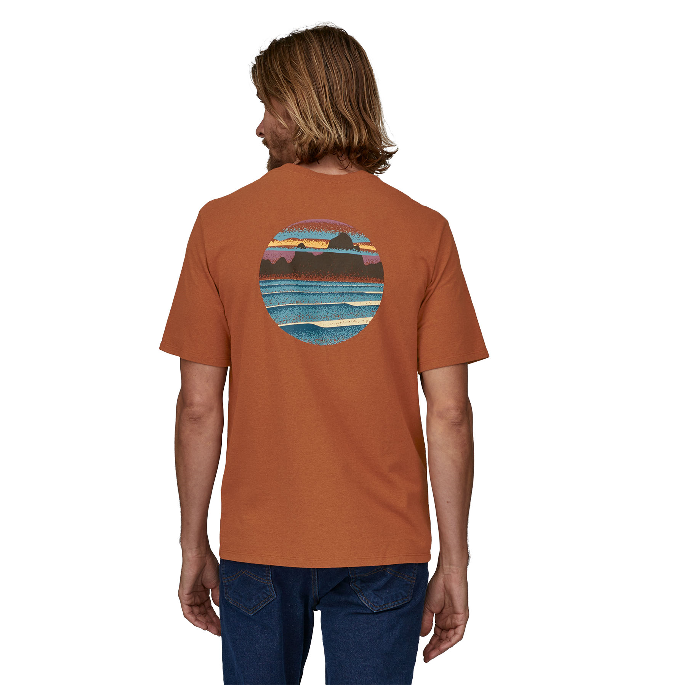 La Camiseta de Hombre Skyline Stencil Responsibili-Tee®, de Patagonia®, cuenta con un diseño estampado en serigrafía sobre una camiseta fabricada a partir de tela reciclada 100% posconsumo.
